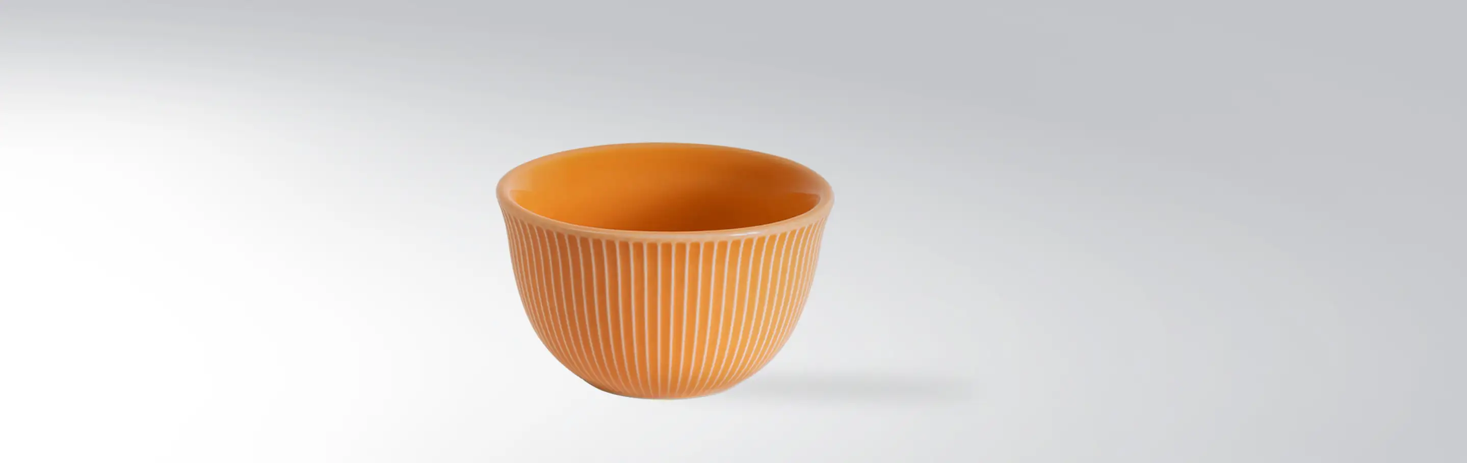 Erhältlich in drei Grössen und vier ausdrucksstarken Farben, sind sie ein Muss für alle, die Kaffee mit Stil geniessen möchten. Diese orange Boram Um Tasting Tasse in der Grösse 120ml ist die mittlere der Reihe.