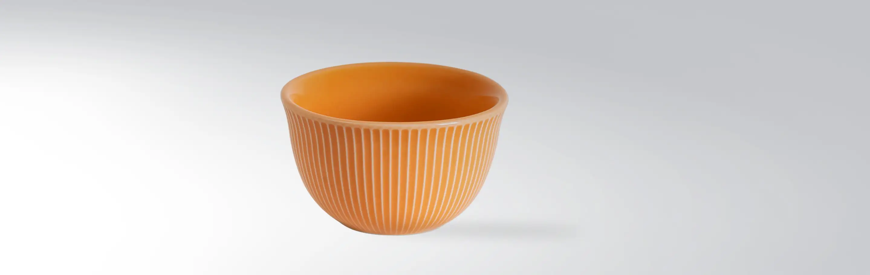 Erhältlich in drei Grössen und vier ausdrucksstarken Farben, sind sie ein Muss für alle, die Kaffee mit Stil geniessen möchten. Diese orange Boram Um Tasting Tasse in der Grösse 120ml ist die grösste der Reihe.