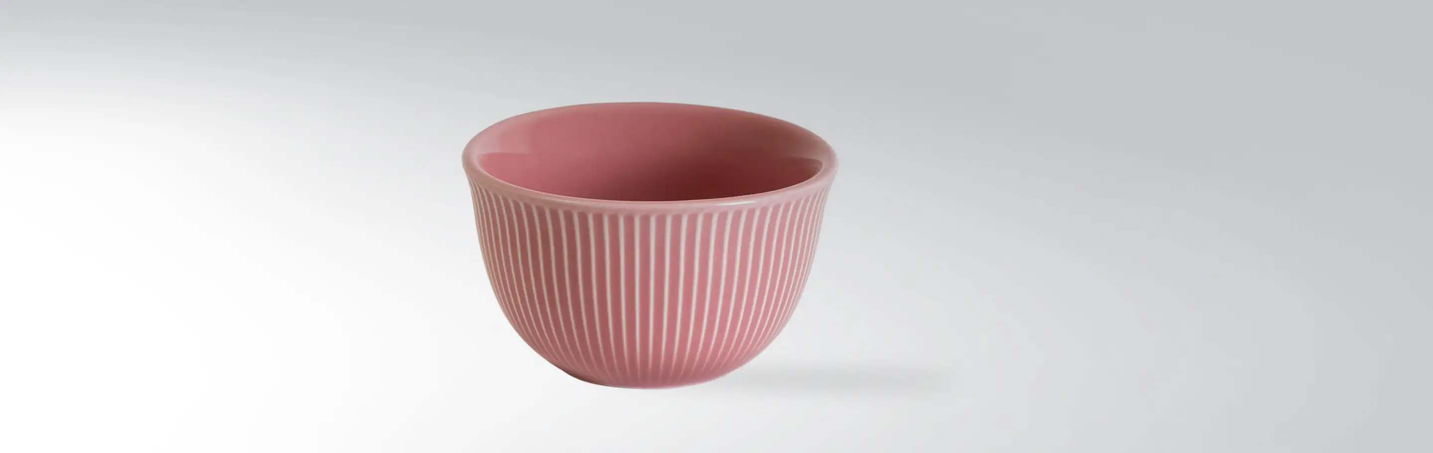 Erhältlich in drei Grössen und vier ausdrucksstarken Farben, sind sie ein Muss für alle, die Kaffee mit Stil geniessen möchten. Diese pinkfarbige Boram Um Tasting Tasse in der Grösse 120ml ist die grösste der Reihe.