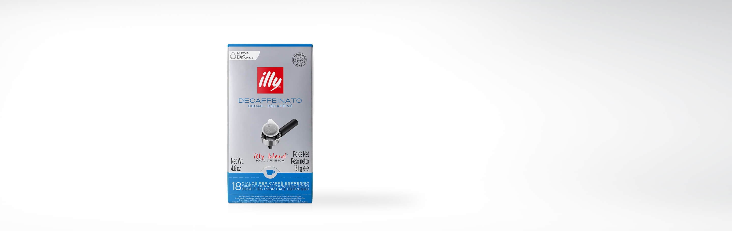 Die Verpackung beinhaltet 18 E.S.E. Kaffeepads in Einzelportionen, entkoffeiniert.