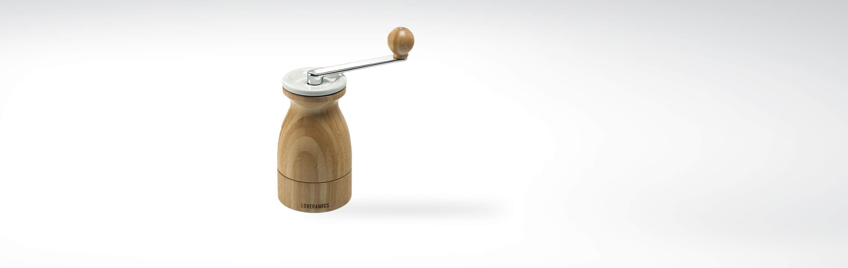 Der untere Teil der Loveramics Kaffeemühle hat eine Auffangtasse aus massivem Bambus mit einem flachen Boden. Das gibt eine gute Stabilität beim Mahlen. Das ergonomische Design ermöglicht es einerseits freihändig eine effiziente Mahlposition zu haben, andererseits kann die Handmühle auf einer ebenen Fläche für einen stabileren Mahlvorgang abstellt werden.