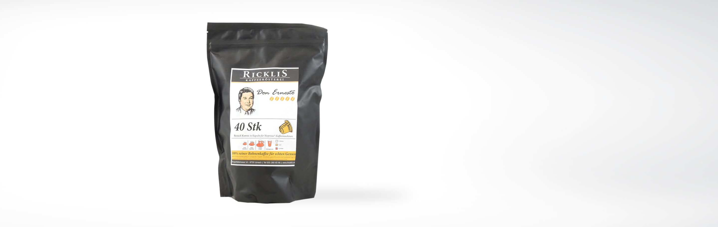 Entdecke die Kunst des Kaffeegenusses mit RickliS Don Ernesto Kapseln. Einzigartig komponiert für das fünfzigjährige Jubiläum der RickliS Kaffeerösterei, ehren diese Kapseln den Gründer Ernst Rickli durch eine exquisit ausgewählte Mischung der besten Kaffeebohnen.