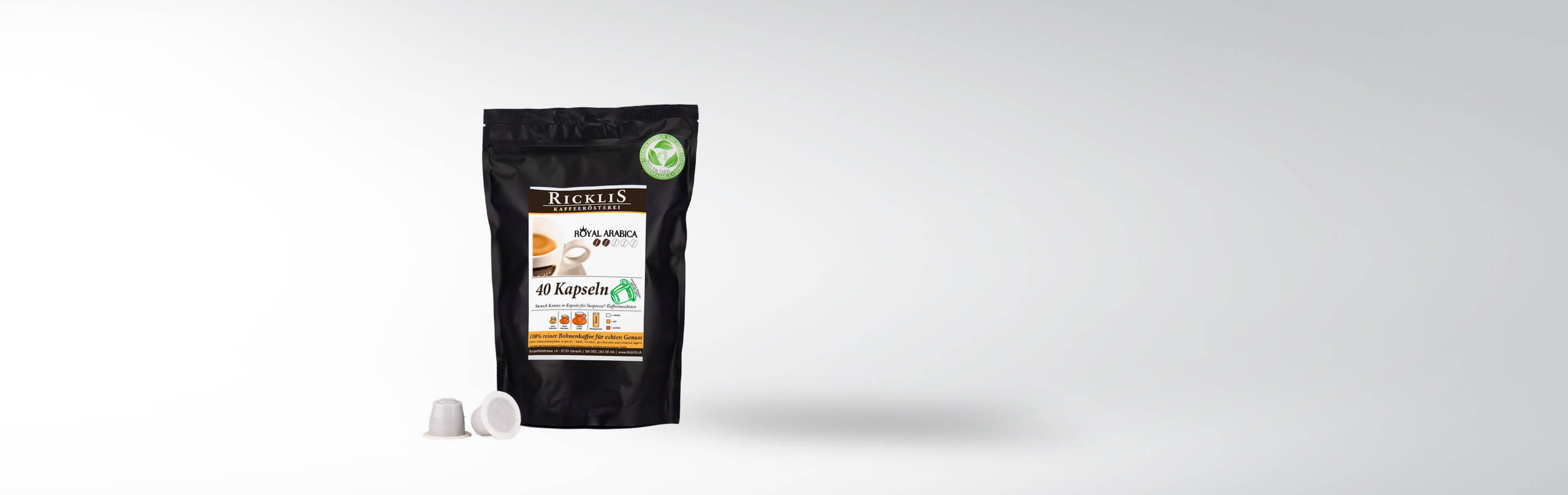 Mit den RickliS Royal Arabica Kapseln entscheidest Du Dich nicht nur für erstklassigen Kaffee, sondern auch für Umweltbewusstsein. Die 40 einzelverpackten, kompostierbaren Kapseln unterstreichen unser Engagement für Nachhaltigkeit und bieten Dir die Möglichkeit, Deinen Kaffeegenuss mit gutem Gewissen zu geniessen. Dank des EN 13432-Zertifikats kannst Du sicher sein, dass jede Kapsel biologisch abbaubar ist.
