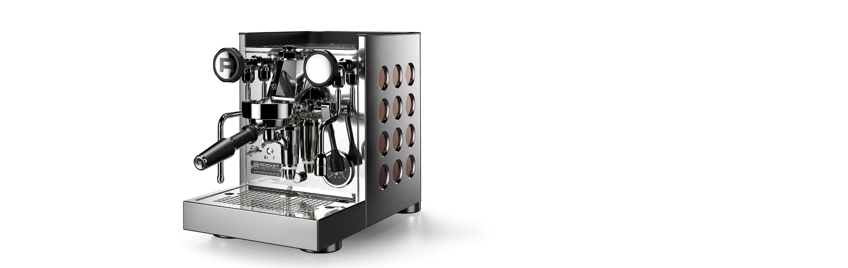 Trotz dem kompakten Design von Valerio Cometti ist die Appartemento ein vollwertige Zweikreismaschien mit E61 Brühgruppe. Die abgerundeten Seiten verleihen der Maschine eine völlig neue ästhetische Dimension. Die sanften Kurven erzeugen einen faszinierenden visuellen Reiz, während das Rocket-Logo in einer neuen vertikalen Ausrichtung präsentiert wird. Die auffälligen Kreise auf den Seiten der Maschine wurden durch eine Prägung hervorgehoben, die ihnen eine räumliche Dimension verleiht.