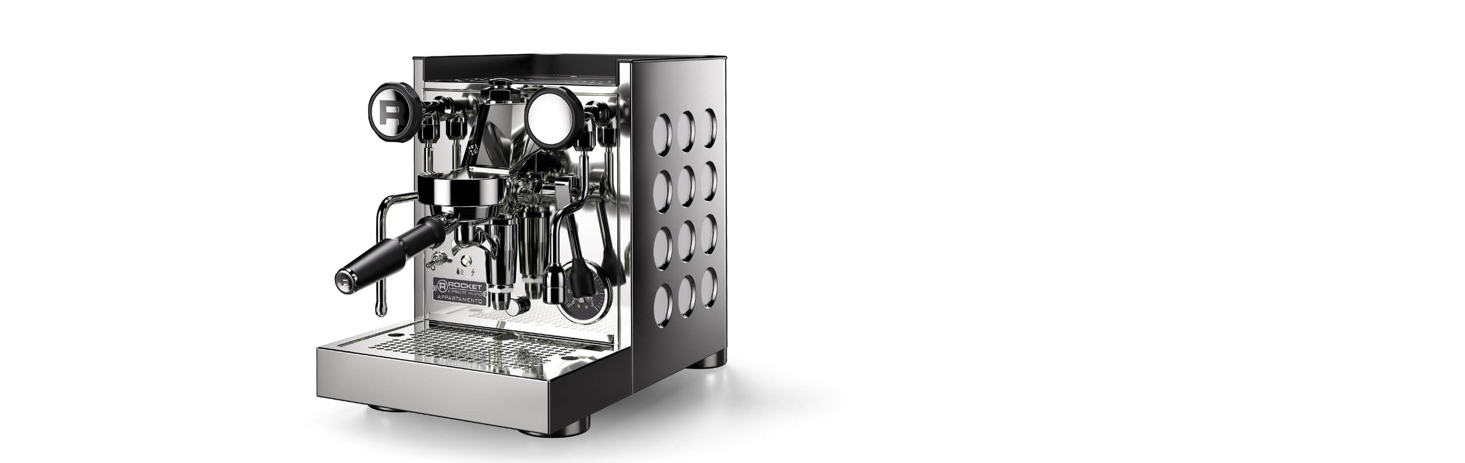 Trotz dem kompakten Design von Valerio Cometti ist die Appartemento ein vollwertige Zweikreismaschien mit E61 Brühgruppe. Die abgerundeten Seiten verleihen der Maschine eine völlig neue ästhetische Dimension. Die sanften Kurven erzeugen einen faszinierenden visuellen Reiz, während das Rocket-Logo in einer neuen vertikalen Ausrichtung präsentiert wird. Die auffälligen Kreise auf den Seiten der Maschine wurden durch eine Prägung hervorgehoben, die ihnen eine räumliche Dimension verleiht.